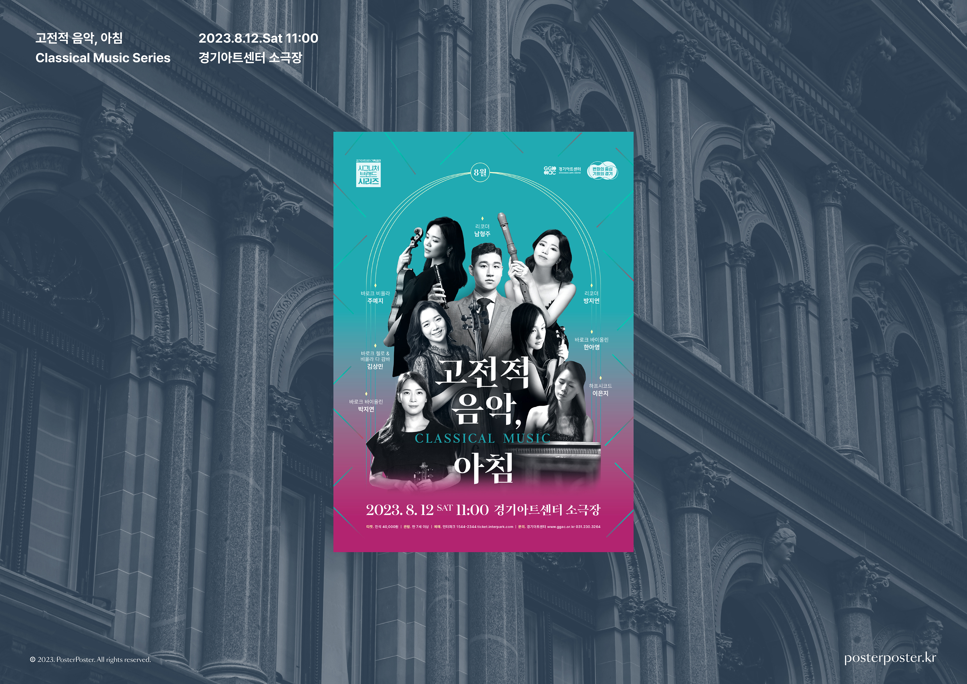 클래식 브랜드 시리즈 '고전적 음악'은 시간 속에 매몰된 고전을 선보이고 가치를 알리기 위해, 여러 협연자와 함께 다양한 음악, 다양한 이야기를 전하는 공연입니다. 공연브랜드의 일관성을 위해서 패턴과 아치형태로 클래식 공연의 기품을 더한 디자인입니다.
